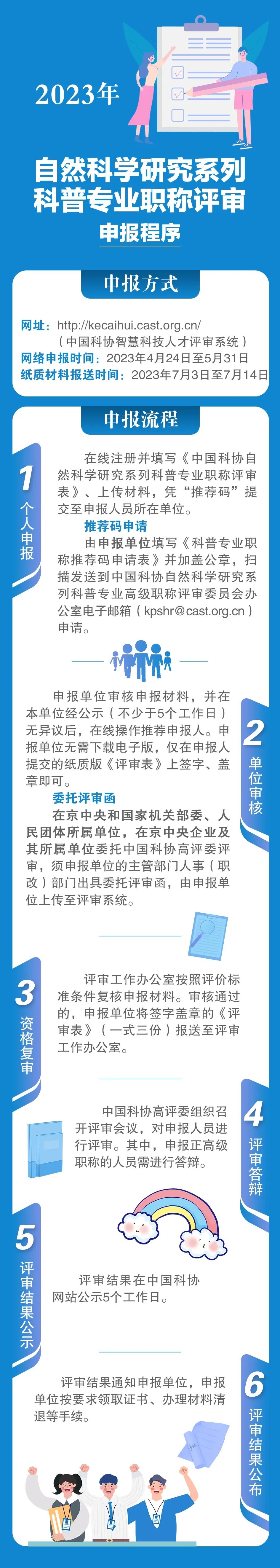 中国科协2023年度自然科学研究系列科普专业职称评审已开始申报,请有意向且符合条件的人员关注申报,按通知要求需在“中国科协智慧科技人才评审系统”(http://kecaihui.cast.org.cn/)进行网络在线填报。